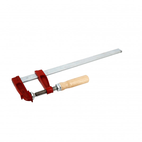 Filetage zingué. Poignée striée en bois. Tête et coulisseau en fonte modulaire. Tête emmanchée à chaud et verrouillée sur la barre en acier zinguée. Saillie (A) : 90 mm Capacité (B) : 400 mm Section (F) : 30 x 8 mm
