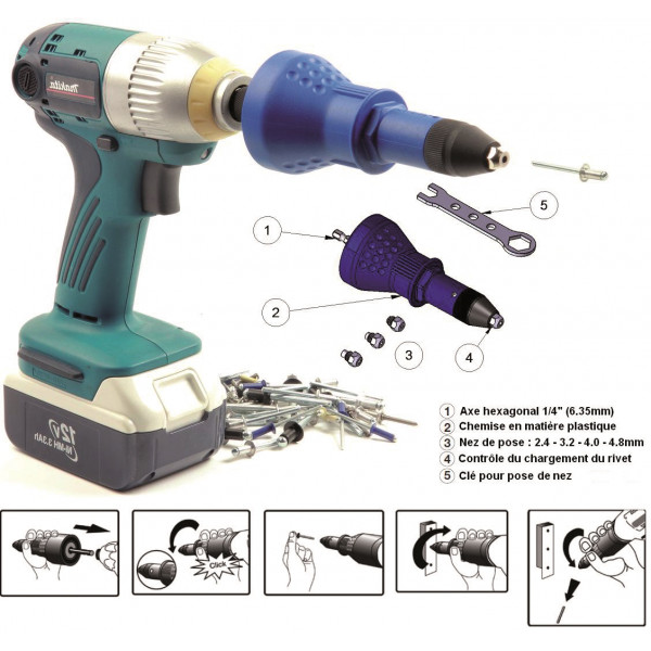 |Outil à Riveter||Vitesse maximum : 1000 t/min||Poids : 280 g||Montage : Emmanchement mâle 1 /4|| |Transformez rapidement et simplement une perceuse/visseuse classique sans fil, électrique ou pneumatique en outil à riveter ou à sertir écrous et goujons.||Outil à Riveter : pour rivets tout aluminium 2,4 à 4,8 mm maxi, pour rivets en acier 2,4 à 4,00 mm maxi, 4 nez de pose de 2.4, 3.2, 4.0, et 4.8 mm||La nature et la capacité de l?outil ne permettent pas de casser le tirant du rivet (voir fig.). Il faut donc attendre la fin du cycle pour que le tirant se sépare du rivet.||