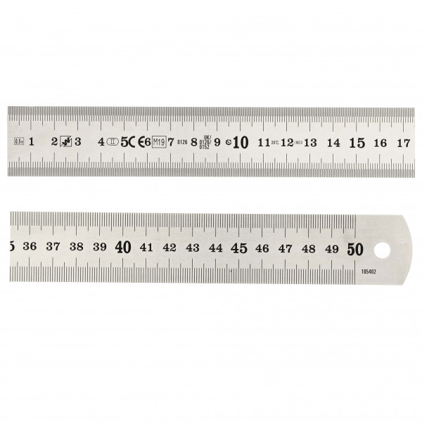 Règlet - Gamme professionnelle demi rigide - Matière : inox - Norme : classe II - Gradué haut et bas 1 face en 1/2 mm + mm - Brillant - Gravure Laser - longueur : 1000mm - Section : 30 x 1 mm