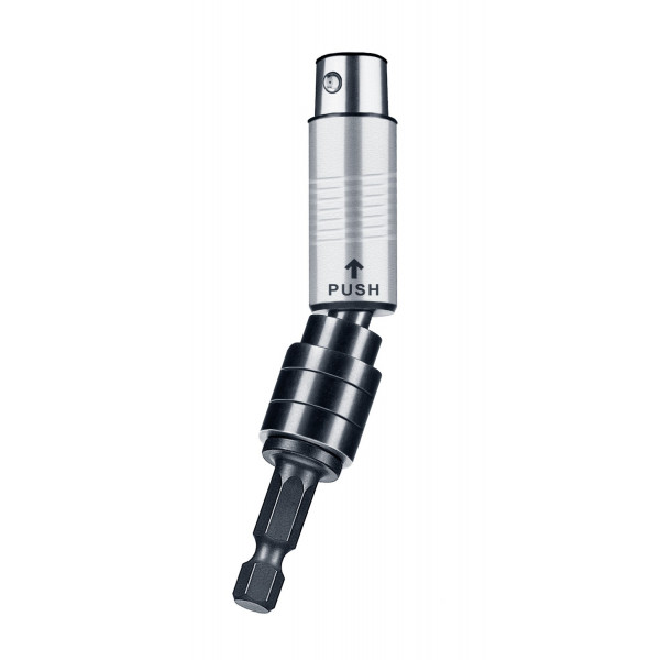 |Porte-embout de vissage orientable à changement rapide||Longueur : 94 mm||Largeur : 15,5 mm||Montage : Emmanchement mâle hexagonal en 1/4?||Poids : 90 g||Droite ou orientable avec un entraînement à tête sphérique permettant de travailler des angles jusqu'à 25°.||Egalement disponible sous blister pour 0,80? en supplément.||