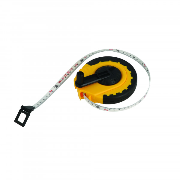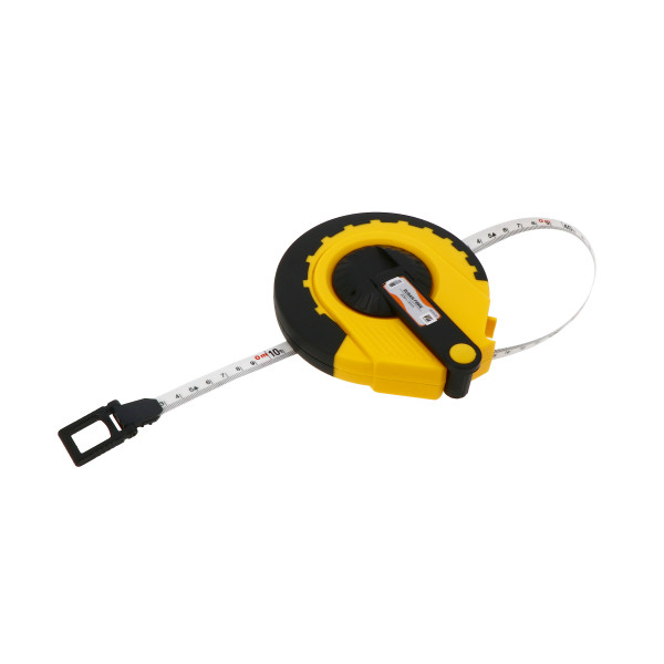 Blocage et clip ceinture. Un prix très compétitif. Boîtier ABS Chromé. Ruban 0,115 mm jaune mat classe II. Dimensions : 10 m x 25 mm