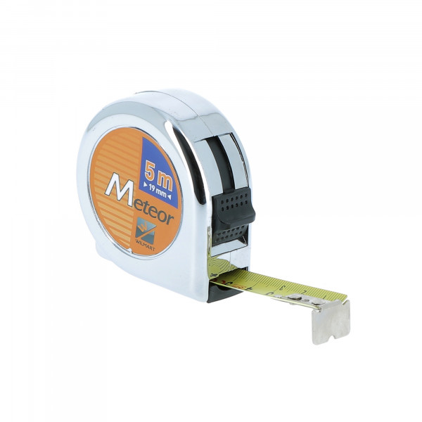 Blocage automatique du ruban. Après avoir sorti le ruban, il n'est pas nécessaire d'activer le blocage, celui-ci est permanent. Pour rentrer le ruban dans le boîtier il faut activer l'une des 2 touches. Ruban jaune en acier carbone 60C, fini mat permettant une bonne visibilité même avec un éclairage de haute intensité. Boîtier ABS avec enveloppe élastomère. Dimensions : 5 m x 25 mm. Longueur totale du boîtier : 89mm. Peut être conditionné sous blister (supplément 0,80 €)