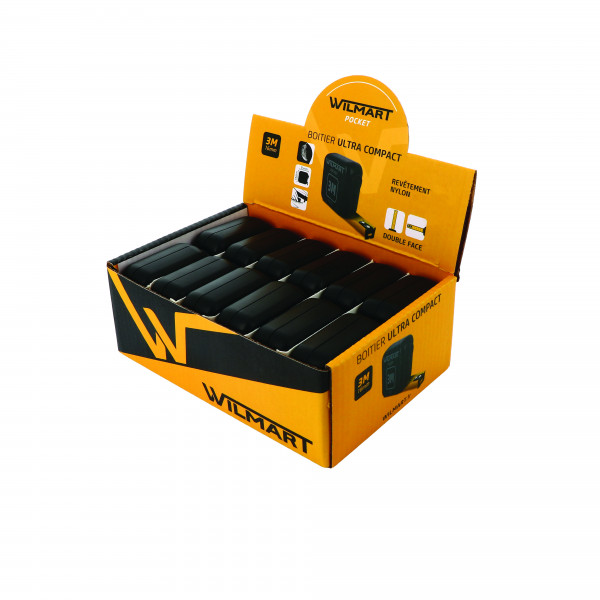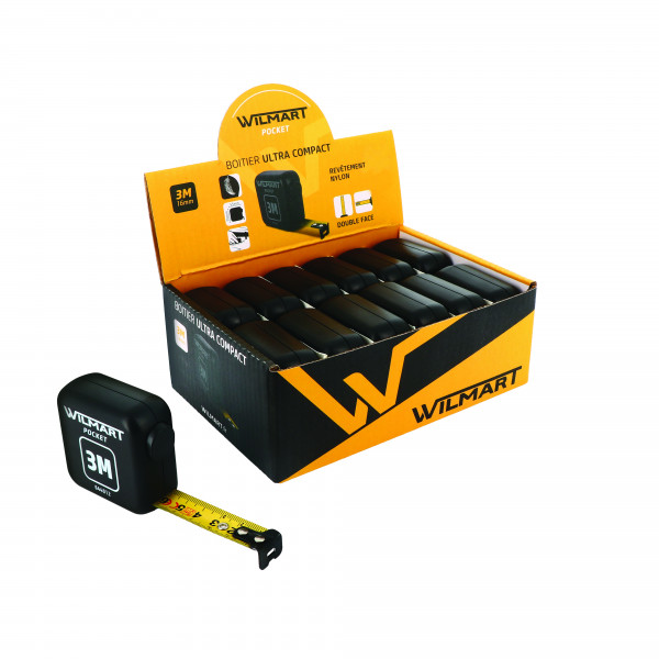 Mètre ruban compact et robuste, double stop avec système de blocage. Clip ceinture et frein intégré. Ruban en acier carbone 60C jaune mat classe II pour une lecture nette et durable. Boîtier ABS bi-matière avec élastomère strié au toucher caoutchouteux. Dimensions du ruban : 3 m x 16 mm. Dimensions du produit : 55 mm x 54mm. Conditionnement blister possible contre supplément.