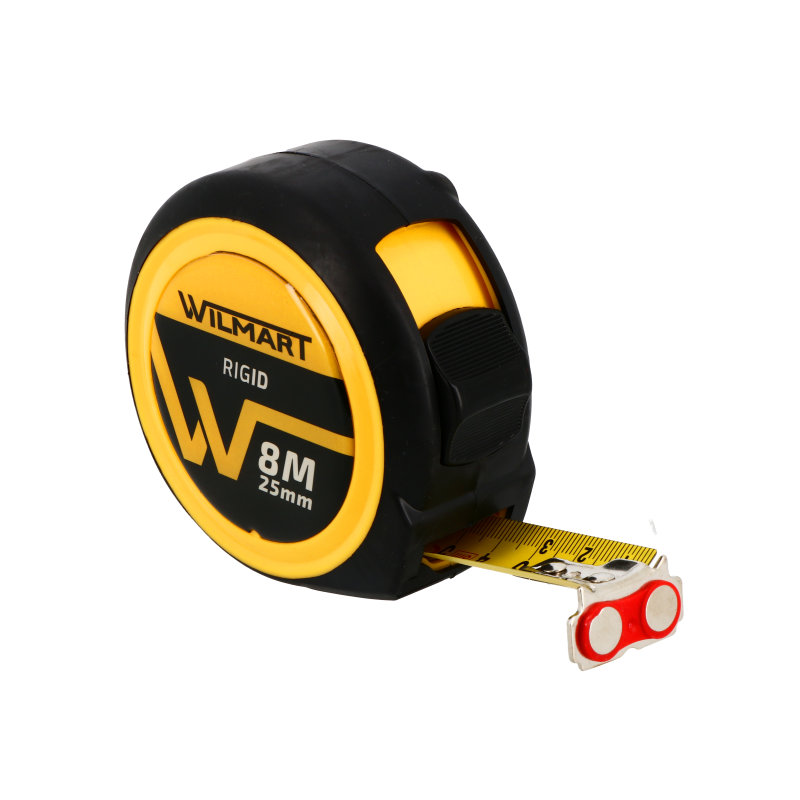 Blocage automatique du ruban. Après avoir sorti le ruban, il n'est pas nécessaire d'activer le blocage, celui-ci est permanent. Pour rentrer le ruban dans le boîtier il faut activer l'une des 2 touches. Ruban jaune, finition mat permettant une bonne lisibilité même sous haute luminosité. Boîtier ABS avec enveloppe élastomère. Dimensions : 8 m x 25 mm. Longueur totale du boîtier : 103mm. Peut être conditionné sous blister (supplément 0,80 €)