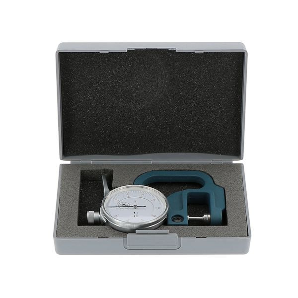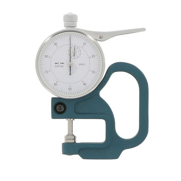 Calibre d'épaisseur avec cadran Lecture : 1/100 Capacité : 0-10 mm Profondeur : 30 mm Corps métal revêtu. Tige abaissée en position repos avec relevage manuel.