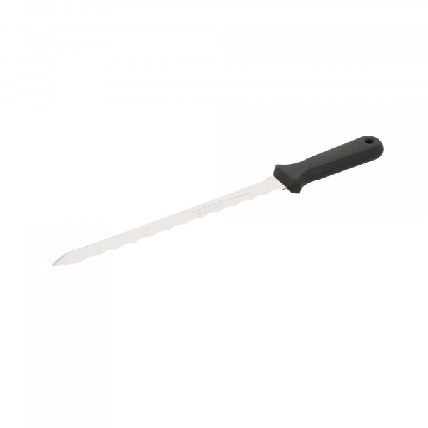 Couteau de plaquiste pour la découpe des isolants Longueur de lame : 280 mm Manche en bois Poids : 160g Lame Acier inox 280 mm Une face matériaux d'isolation. Une face laine de roche et fibre de verre.
