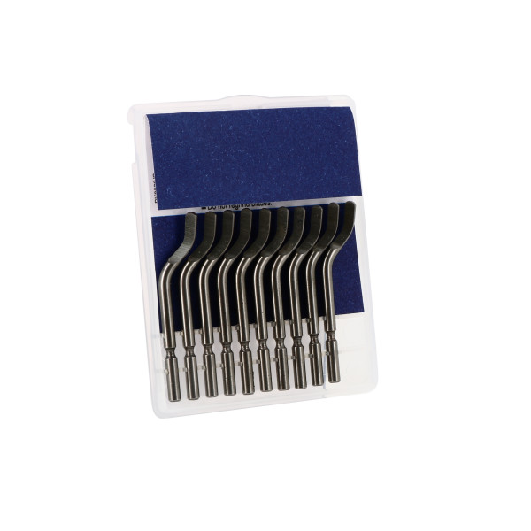 Ebavurage simultané des 2 côtés extérieurs de la tôle. Capacité de 0 à 12mm. Les lames sont affûtées sur les 2 faces. Protection de la main. Utilisable avec une seule lame pour les angles. Manche ABS Comprend 1 protection et 2 lames N80 Poids : 199 g