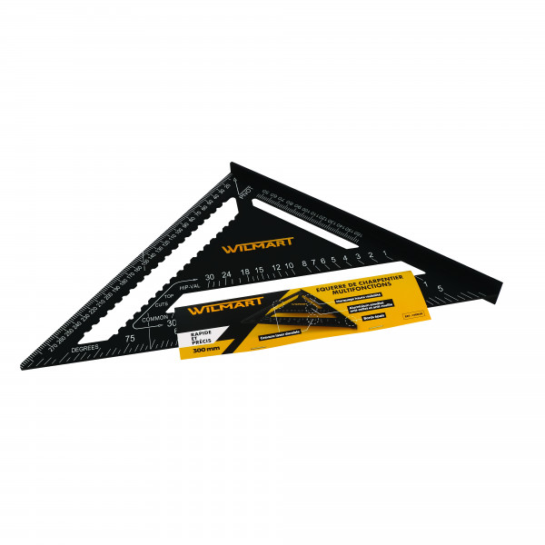 Egalement appelée équerre alsacienneEn acier spécial laqué.Branche semi rigide épaisseur 2 mm.Repère de traçage sur le talon de 5 en 5 mm. Graduation mm sur les 2 arêtes de la grande branche.Section 36 x 1,7 mm. Longueur : 700 mm Base : 300 mm Poids : 360 g