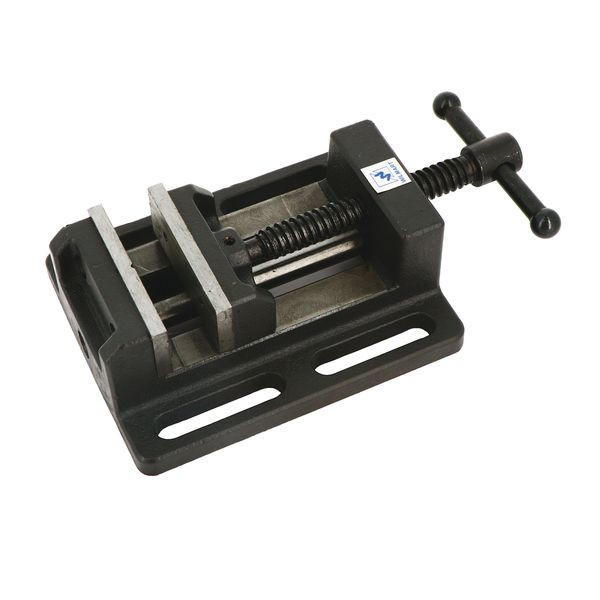 Etau de perçage en fonte. Série standard. Mâchoire en acier trempé. 1 face lisse, 1 face rainurée. Largeur mors : 80 mm Ouverture : 75 mm Poids : 3,8 kg A : 104 mm B : 50 mm C : 12 mm D : 150 mm