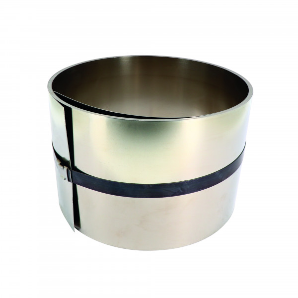 Clinquant acier Largeur : 150 mm Epaisseur : 0,8 mm Feuille d’'inox enroulée - longueur 5 m. Inox écroui extra dur. Dureté : 1 500 - 1 700 N/mm² Résistance : <1500 N/mm² jusque 0,02mm, <1700N/mm² jusque 1mm Sur commande (Délai 4 semaines. Max. 1semaine en port express.).