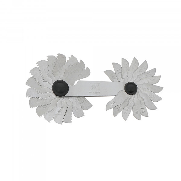 Lame en acier poli trempé, sur une monture en acier. Le pas est indiqué sur chaque lame. Nombre de lames : 31 Norme : METRIQUE Pas : 0,25 0,30 0,35 0,40 0,45 0,50 0,55 0,60 0,65 0,70 0,75 0,80 0,85 0,90 1,00 1,10 1,20 1,25 1,30 1,40 1,50 1,60 1,70 1,75 1,80 1,90 2,00 2,25 2,50 2,75 3,00 Lame 60°