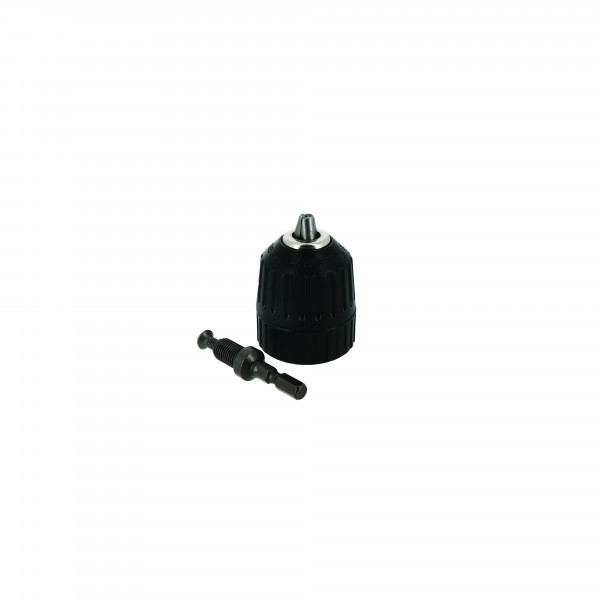 |Mandrin sans clé série professionnelle avec système de verrouillage du serrage||Classe : M||Mors : carbure||Capacité de serrage : 1.5 à 10 mm||Dimension A : 42.7 mm||Dimension B : 55 mm||Dimension C : 64 mm||Trou central : 5.5||Chemise : version 1 (Acier + Nylon) avec les chemises avant et arrière qui sont constituées d?acier recouvert de nylon.||Montage : 3/8?x24||Poids : 165 g||Pour perceuses réversibles et à percussion jusqu'à 1100W.||Serrage du foret dans le mandrin : A l?inverse du mandrin auto-serrant, le mandrin sans clé à serrage manuel ne continue pas de se serrer pendant le perçage.||Pour les séries PRO les mandrins sont équipés d?un système de verrouillage. Une fois le premier «clac» déclenché, finaliser le serrage en effectuant encore 1/2 tour.||