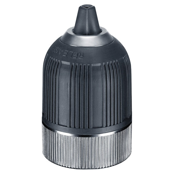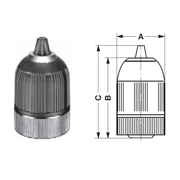 |Mandrin sans clé série professionnelle avec système verrouillage du serrage||Classe : M||Mors : carbure||Capacité de serrage : 1.5 à 13 mm||Dimension A : 42.7 mm||Dimension B : 64 mm||Dimension C : 75.3 mm||Trou central : 6.5||Chemise : version 2 (Acier et Nylon) avec la chemise avant qui est constituée d?acier recouvert de nylon et la chemise arrière exclusivement d?acier.||Montage : 1/2?x20||Poids : 282 g||Pour perceuses réversibles et à percussion jusqu'à 1100W.||Serrage du foret dans le mandrin : A l?inverse du mandrin auto-serrant, le mandrin sans clé à serrage manuel ne continue pas de se serrer pendant le perçage.||Pour les séries PRO les mandrins sont équipés d?un système de verrouillage. Une fois le premier «clac» déclenché, finaliser le serrage en effectuant encore 1/2 tour.||