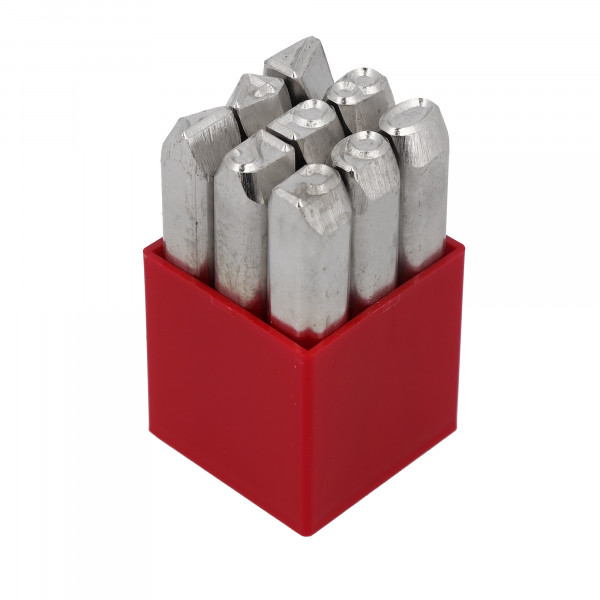 Acier étiré au carbone. Dureté côté empreinte HRC 60-62. Côté frappe traitement anti éclat. Finition zinguée. Hauteur : 12 mm Endroit, à gauche