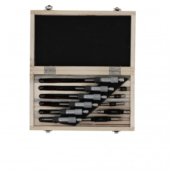 Lecture au 1/100. Col de cygne acier avec isolant thermique. Molette d'avance rapide, approche finale par cliquet. Touche carbure Ø 6,5 mm Livré avec une jauge de contrôle et une clé de serrage. Présentation verticale ou horizontale. Capacité : 0-150 mm Nombre de pièces : 6