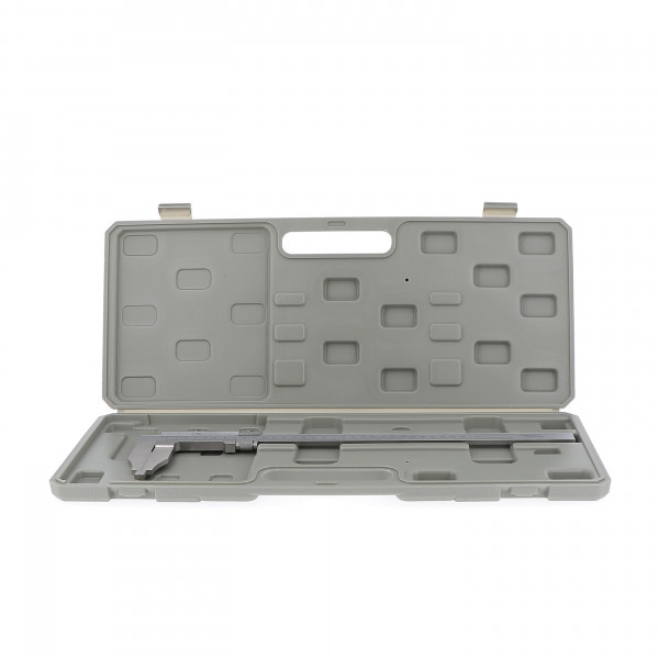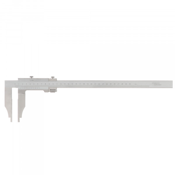 Inox chromé mat. Règle avec section importante pour un bon guidage des grandes longueurs de bec. Vernier au 1/50 mono bloc avec vis de blocage. Réglage fin. Capacité : 400 mm Hauteur bec : 90 mm Section : 24 x 5,5 mm