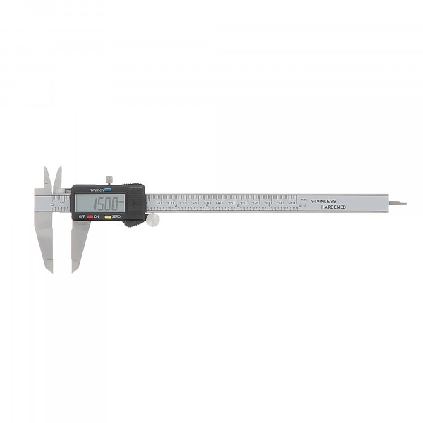 Bec simple grande capacité. 3 boutons : - marche Arrêt (ON/OFF) - changement d'unité (mm/inch) - remise à zéro(ZERO). Lecture et affichage au 1/100. Vis de blocage sur le vernier et réglage fin. Sortie de données RS232. Règle, becs en Inox. Capacité : 300 mm Précision mesurée plein bec : 3/100 Hauteur bec : 75 mm