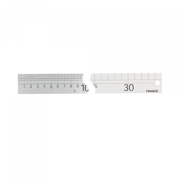 Graduations sur 1 face, un bord mm, un bord en ½ mm. Gravure laser. Longueur : 1500 mm Section : 30 x 1 mm
