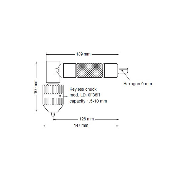 |Renvoi d?angle a 90°||Montage : Hexagonal 9 mm||Usage : Mandrin à clé (3/8 x 24??) AH10F38R avec capacité 1,5 - 10 mm.||Poids : 455||Couple maxi : 29 Nm||Pour perceuses et visseuses portatives|| |Renvoi d?angle 90° adaptable sur tous types de perceuses ou visseuses||Rapport de transmission (Vperceuse/Vsortie) : 1/0,8.||Capacité maximum de perçage : 10mm.||Vitesse maxi = 2100tr/mn.||Couple maxi = 29 Nm||Poignée élastomère «anti-dérapante»||