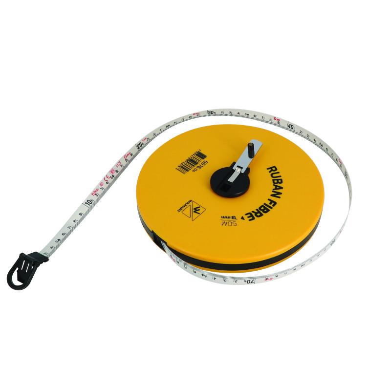 Boîtier renforcé par un anneau métallique. Ruban jaune fluorescent en fibre. Graduation bi mm recto verso. Le 0 est à la boucle crochet. Manivelle escamotable. Dimensions : 20 m x 15 mm
