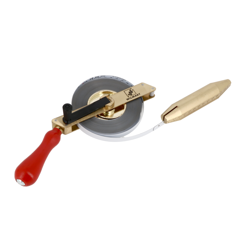Etrier et manivelle en laiton. Le laiton évite les frictions et n'est pas conducteur. Poignée bois. Ruban acier laqué blanc. Attache rapide du lest au ruban. Lest 750g gradué en laiton. S’utilise pour des liquides colorés. Dimensions : 30 m x 13 mm