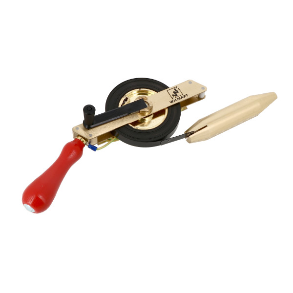 Etrier et manivelle en laiton. Le laiton évite les frictions et n'est pas conducteur. Poignée bois. Ruban acier laqué blanc. Attache rapide du lest au ruban. Lest 750g gradué en laiton. S’utilise pour des liquides colorés. Dimensions : 30 m x 13 mm