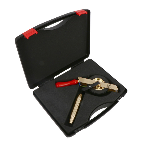 Etrier et manivelle en laiton. Le laiton évite les frictions et n'est pas conducteur. Poignée bois. Ruban Inox avec réserve pour les graduations et chiffres. Attache rapide du lest au ruban. Lest 750g gradué en inox. Mise à la terre pour l'écoulement de toutes charges d'électricité statique. Livré avec une valise de transport. Ruban classe II. Norme CEE Dimensions : 20 m x 13 mm