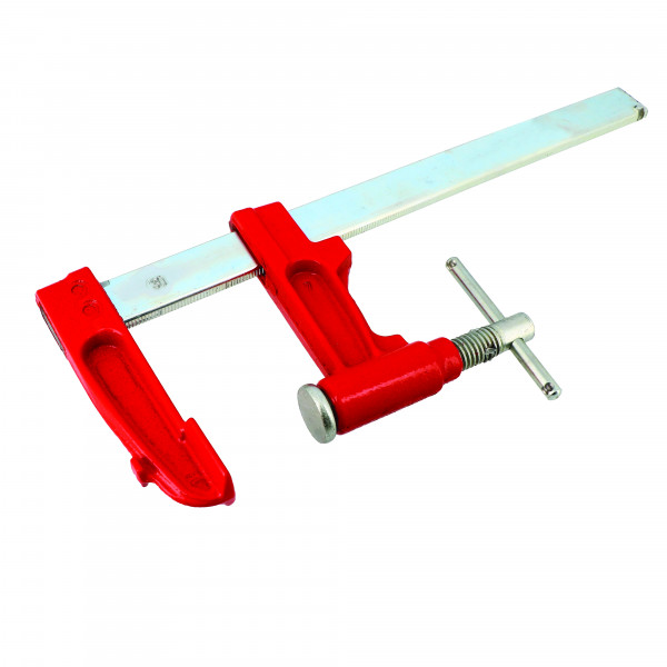 Piston de pression en acier bichromaté. Barre crantée pour un meilleur blocage. Frein en acier trempé sur le coulisseau (E). Puissance de serrage : 1200 kg. Saillie (A) : 140 mm Section (F) : 40 x 10 mm Capacité (B) : 800 mm