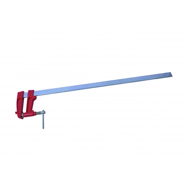 Piston de pression en acier bichromaté. Barre crantée pour un meilleur blocage. Frein en acier trempé sur le coulisseau (E). Puissance de serrage : 1200 kg. Saillie (A) : 120 mm Section (F) : 35 x 8 mm Capacité (B) : 800 mm