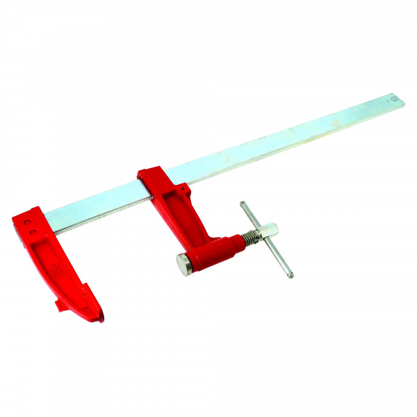 Piston de pression en acier bichromaté. Barre crantée pour un meilleur blocage. Frein en acier trempé sur le coulisseau (E). Puissance de serrage : 1200 kg. Saillie (A) : 90 mm Section (F) : 30 x 8 mm Capacité (B) : 400 mm