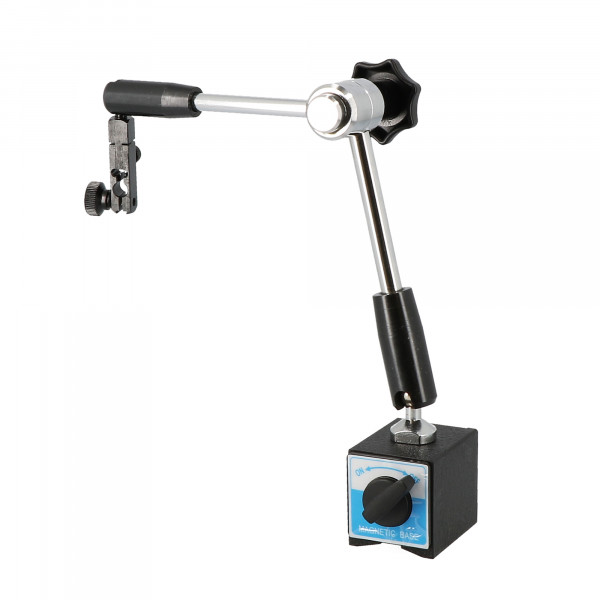 3 axes de rotation. Base magnétique. 3 axes de rotation. Adaptateur pour comparateur avec tige Ø 8mm et pour pépitas. Filetage M8. Dimensions : 65 x 50 x 55 mm. Hauteur max : 280 mm. Force attraction : 80 kg